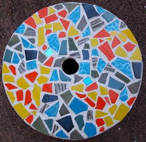 I broke up the tiles into random shapes of a medium size and some were smaller mosaic shapes already – squares / circles. I spread a small section with a thick amount of grout and pressed in the broken tiles, this squashed grout up the sides of the tiles, then I matched similar shapes to them like a jigsaw, pushing them until there was a few millimetres of grout between each tile. Scraping off the excess grout to reuse and to tidy up the edges.