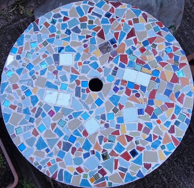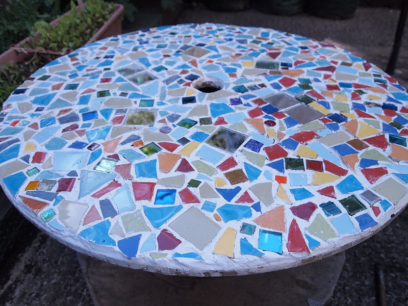 My third project was turning a cable spool into a mosaic garden table, I found the cable spool and some tiles on freecycle after a lot of searching!