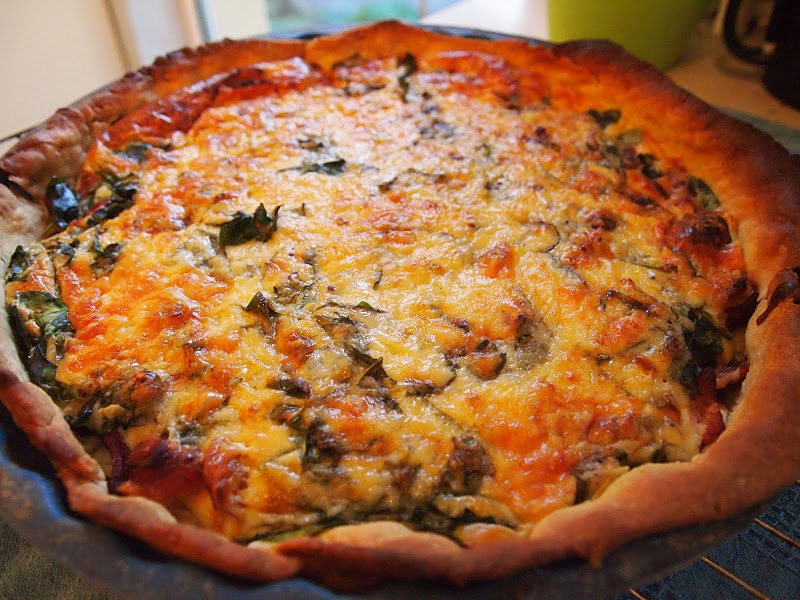 Once the base is cooked I like to spread a thin layer of pesto over it with the back of a spoon. Scatter the leek and bacon over the pastry. Beat the eggs into the sauce and season. Pour the mixture into the case evenly then top with cheese. Bake for 40mins until puffed and golden.