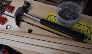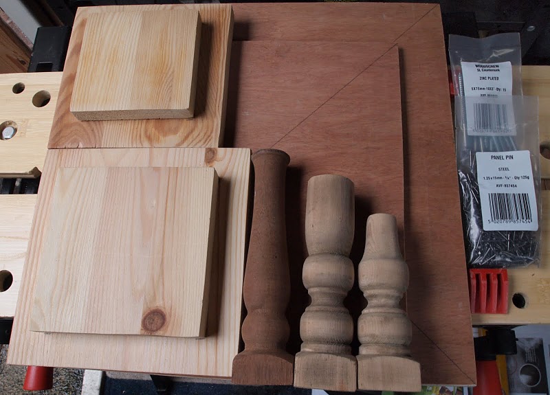 We collected all the wooden parts we needed from Bristol Wood Recycling Project. We got a large sheet of plywood (for the top), three banister posts (for the post), two pieces of thick pine (for the base) and some trim (for decoration). We bought some long screws (75mm) to use top and bottom to hold the structure together, some thin short panel pins to tack on the trim, wood glue and some white wood paint for the finish.
