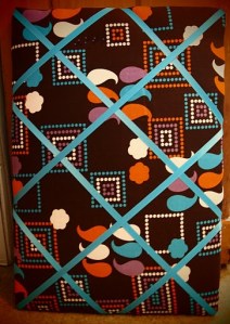 Once the fabric was tightly stapled in place I measured lengths of ribbon to criss cross the front of the board, the ends of each length of ribbon were stapled in place on the back…the style of the board worked really well on the day and added the perfect vintage look.