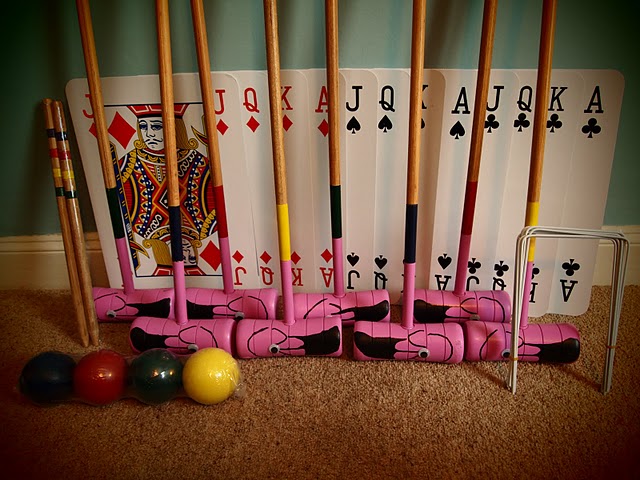 The second activity was a game of croquet. We bought two croquets sets (8 mallets and balls, 20 wickets and 4 posts) and a pack of giant playing cards. We used cable ties and glue to attach the cards to the hoops and set these up on a grassy area, starting from ace and ending at king using the diamond suit. We spray painted the croquet mallets pink and used marker pen and black paint to draw flamingo faces/beaks on the end of each mallet and added googly eyes to the drawn faces.
