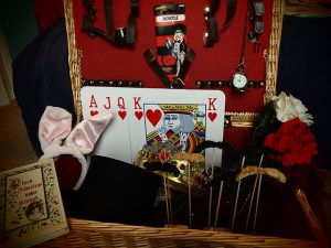 We asked two friends to help us with a photo booth, the camera was set up at the end of a room using the stone wall as a backdrop. We put together a hamper full of props – top hat, rabbit ears, fake moustaches, roses, giant playing cards, feather boa, monocle, pipe, pocket watch and crown. Then leaving the camera in one position for every photo the fun began.