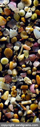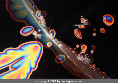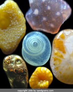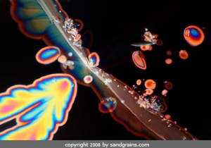 Bottom Right; “A panorama of selected sand grains arranged on a glass slide using acupuncture needles to herd the grains into place. The image is pieced together from half a dozen images taken side by side, and then stitched together into one panoramic image.”