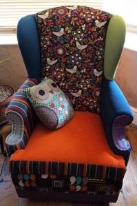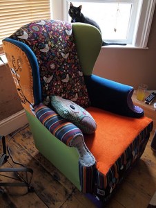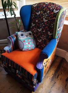 In particular I would like to credit our friend Eddie’s fine upholstering of a wing back chair for us. We chatted through some ideas with him, along the lines of a patchwork design, he suggested that we have different fabric for each section, some of which we provided for him and the rest he supplied. The finished chair is a triumph and we are both so pleased with Eddie’s work, astonishingly wonderful!