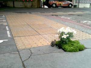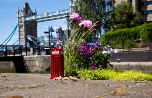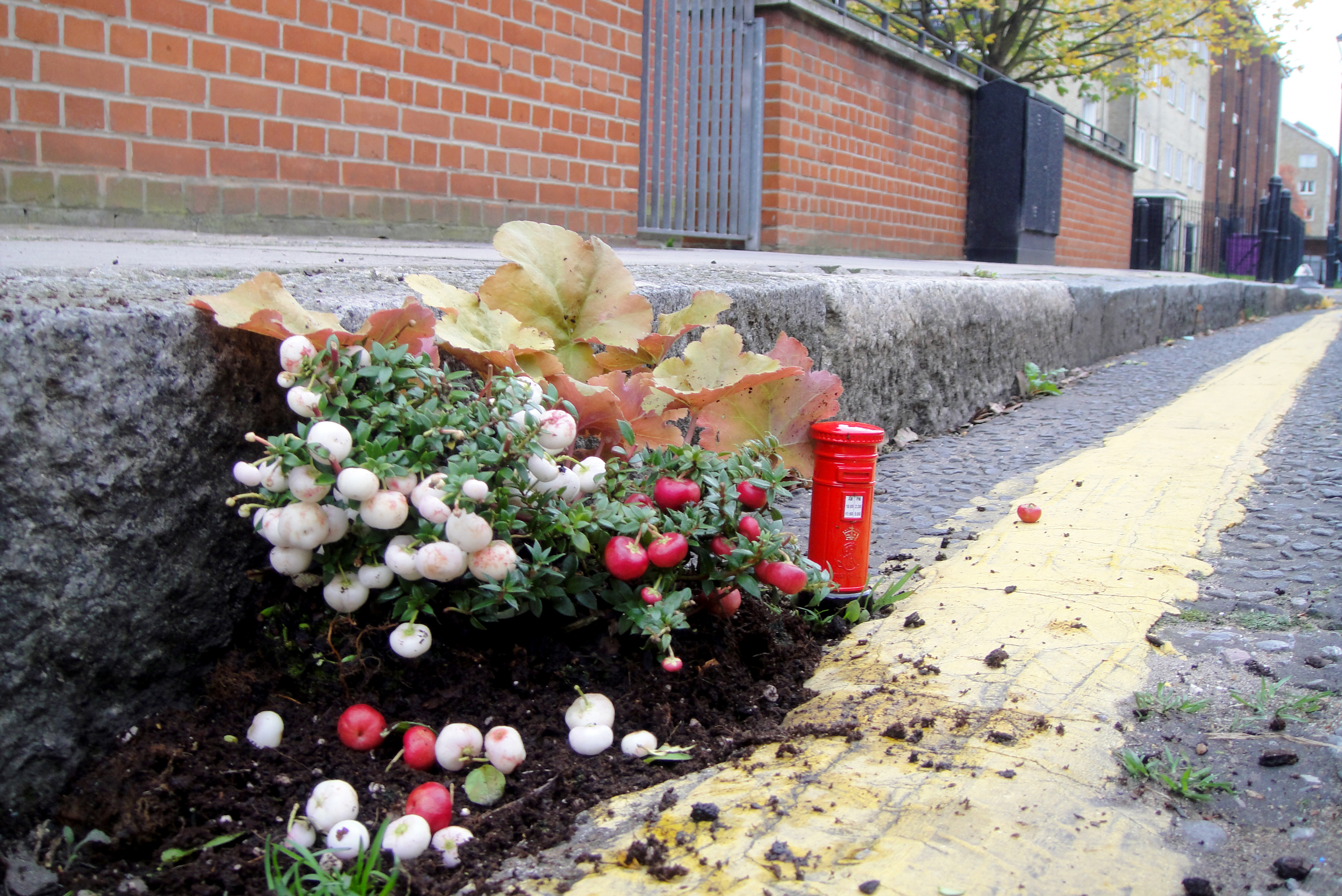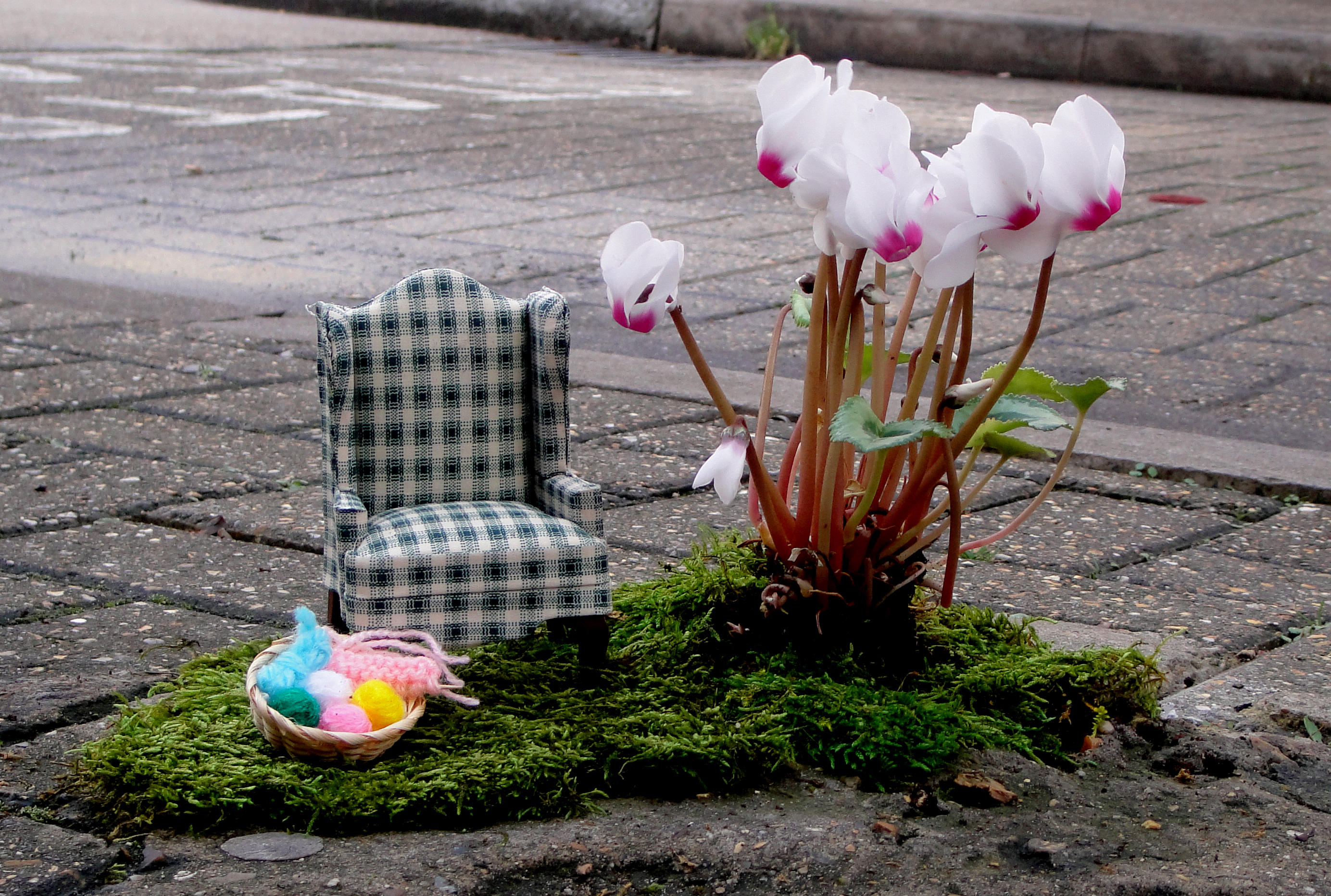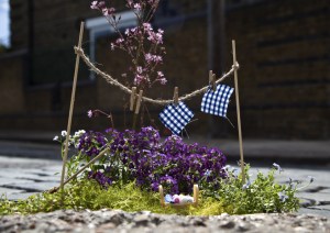 This project caught my eye and reminded me of my post about Slinkachu – both artists create miniature scenes on the streets – The Pothole Gardener brings to life potholes by planting flowers, turf, moss, bushes to brighten up the roads, pavements and walls of London, with some extra props to provide amusement.