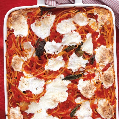 Mix the spaghetti with the tomato sauce, then spoon into a large ovenproof dish, I twirled each spoonful around to create a portion of twisted linguine, making it easier to serve.
