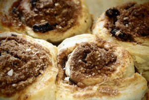 Dot butter over the rolled out pastry and spread out. Spoon on generous amounts of the cinnamon mixture until the pastry is evenly covered. Sprinkle plenty of raisins over this.