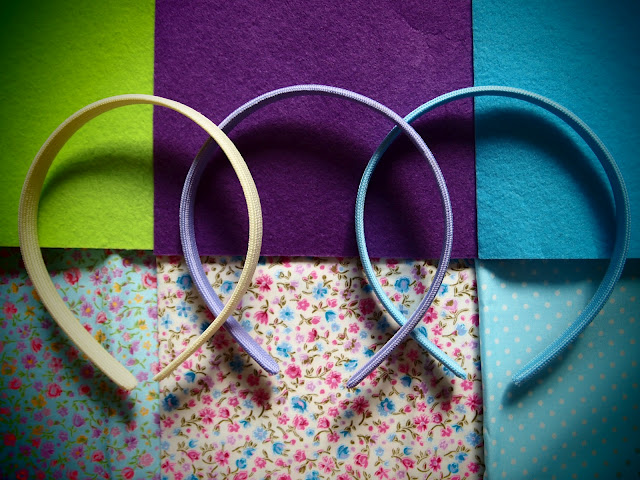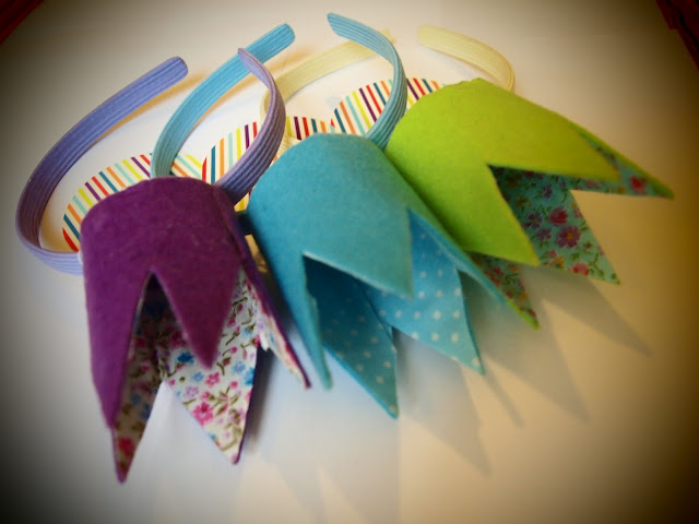 Hairbands (I used yellow, purple & blue – thick material bands make it easier to stick the crowns on)