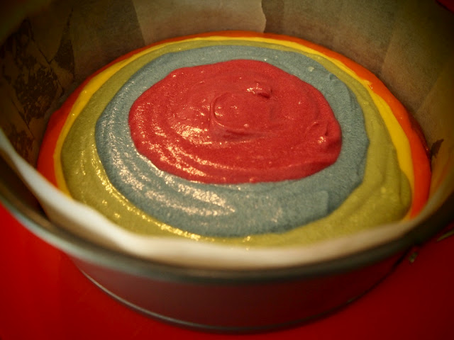 Slowly pour each coloured mixture into the cake tin, one at a time on top of each other until it spreads out forming a smooth surface.