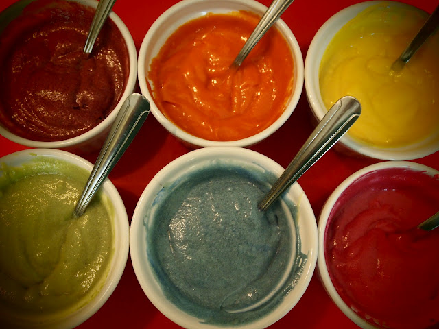 Divide the mixture evenly between 6 small bowls (depending how many colours you are using) add a teaspoon or more of different colour to each bowl, some colours may need more adding to become more vibrant. Mix thoroughly.