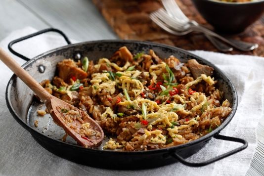 Add curry paste and sugar and fry for 1 min. Tip in the rice and stir to coat in the paste, then add the spring onions and peas. Stir-fry for 2-3 mins until everything is really hot.